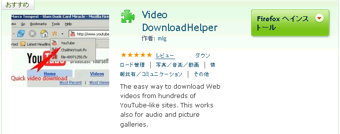 ・おすすめのアドオンから、Video DownloadHelperをインストール