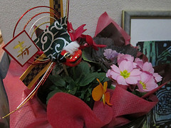 迎春の雰囲気の寄せ植えをいただきました。 (^^ シクラメンと一緒の獅子舞が 可愛らしいです。